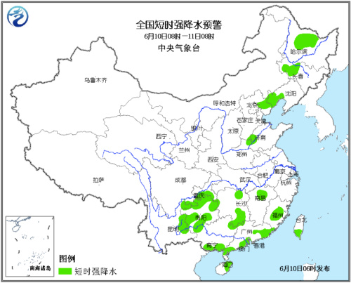 预计6月10日8时至11日8时,内蒙古东部、山西中南部、河北中南部、山东西北部、河南北部、黑龙江中西部、吉林西北部、辽宁西部、江西北部局地将有8-9级雷暴大风或冰雹天气;其中华北、黄淮地区重点关注午后风雹天气。黑龙江中西部、吉林西部、辽宁西南部、河北北部、山东西北部、四川东南部、重庆南部、云南东北部、湖南东部、江西北部、福建、广西南部、广东南部、海南等地将有短时强降水天气,小时雨强20-50毫米,局地大于60毫米。