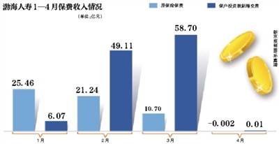 寿险公司的规模保费包括原保险保费收入与会计准则中不被视为保费收入的“保户投资款新增交费”,以及“投连险独立账户新增交费”三个部分。新京报记者比对后发现,在账面上,4月份规模保费收入环比减少的主要原因是,渤海人寿当月保户投资款新增交费的大幅降低。