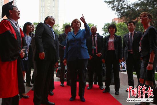6月12日,北京,中国科学院大学中关村校区,德国总理默克尔与欢迎人员交谈。中国青年报·中青在线记者 赵迪/摄
