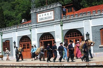 身着清代官服的铁路官吏敲响报站钟,火车进站的轰隆声随着清脆的钟声响起,随后乘客从京张铁路青龙桥车站里走出——这是一群“穿越”百年的人: 穿着旗袍挽着丈夫的富太太,背着木头箱携老扶幼的劳工,还有拿着相机的洋记者。车站月台上小贩的吆喝,往来拉客的黄包车夫……昨日,有着逾百年历史的青龙 桥车站穿越回了清末民初京张铁路通车的时候。