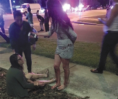 从枪击案现场逃出后,伤者坐在路边,身上血??杉?。
