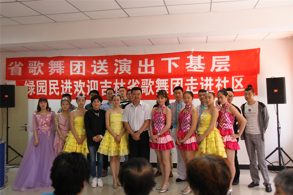为进一步贯彻落实民进长春市委“民进社区行”主题社会服务工作,从5月23日开始到6月3日,由民进绿园区委会倡议发起,联合民进宽城区委、二道区委、朝阳区委、南关区委、东北师大委员会、净月开发区支部、经济技术开发区支部、汽车产业开发区委等多个基层共同邀请吉林省歌舞团,将高水平的文艺表演送进社区。演出共20余场,观众达到4000余人次,受到社区居民的热烈欢迎。