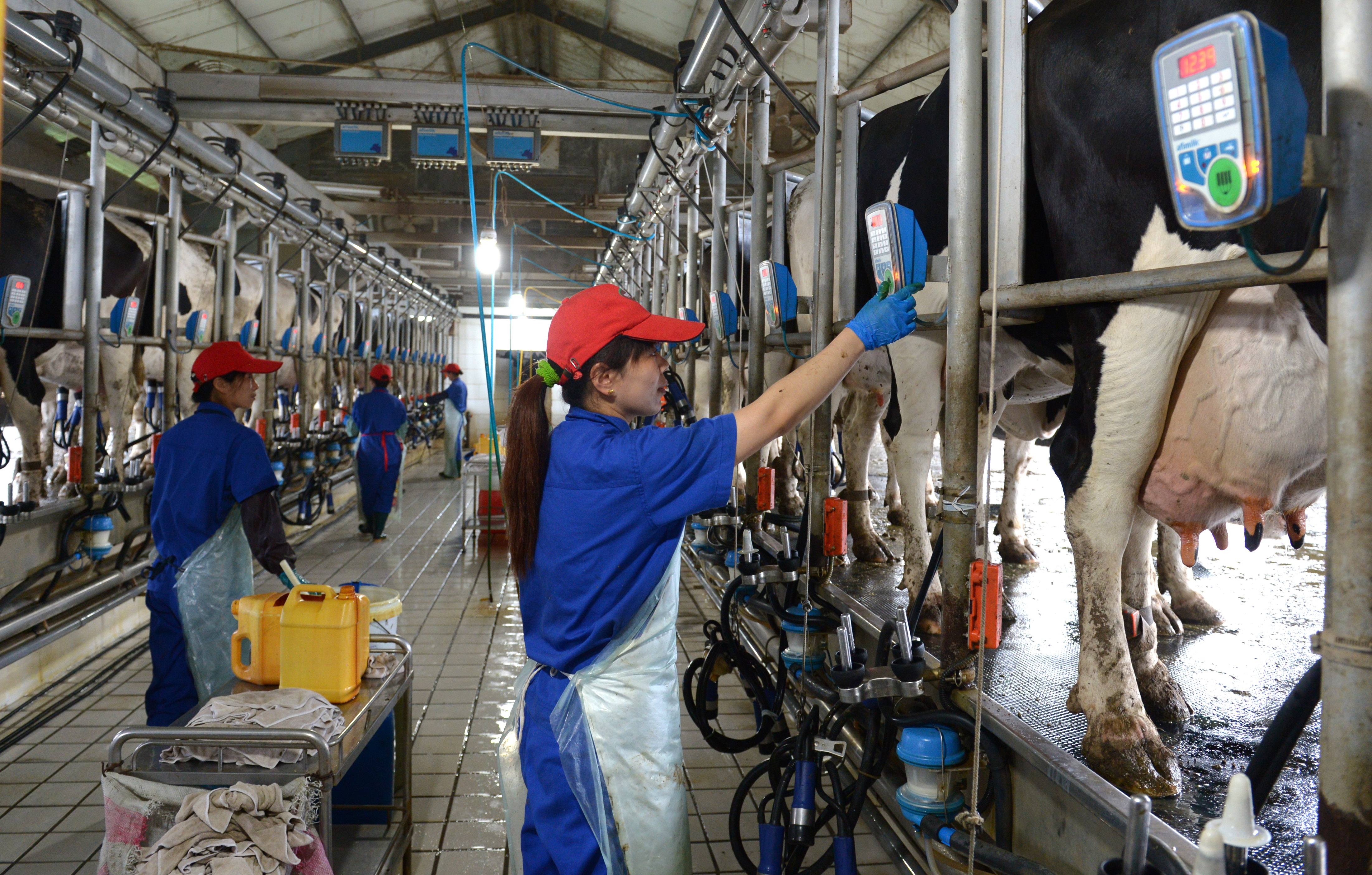 图为银香伟业集团技术人员使用智能管理系统进行挤牛奶。人民政协网记者 齐波摄