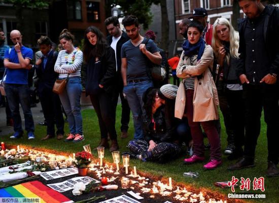资料图:当地时间6月13日,英国伦敦,伦敦市民集会悼念美国奥兰多枪击案遇难者。
