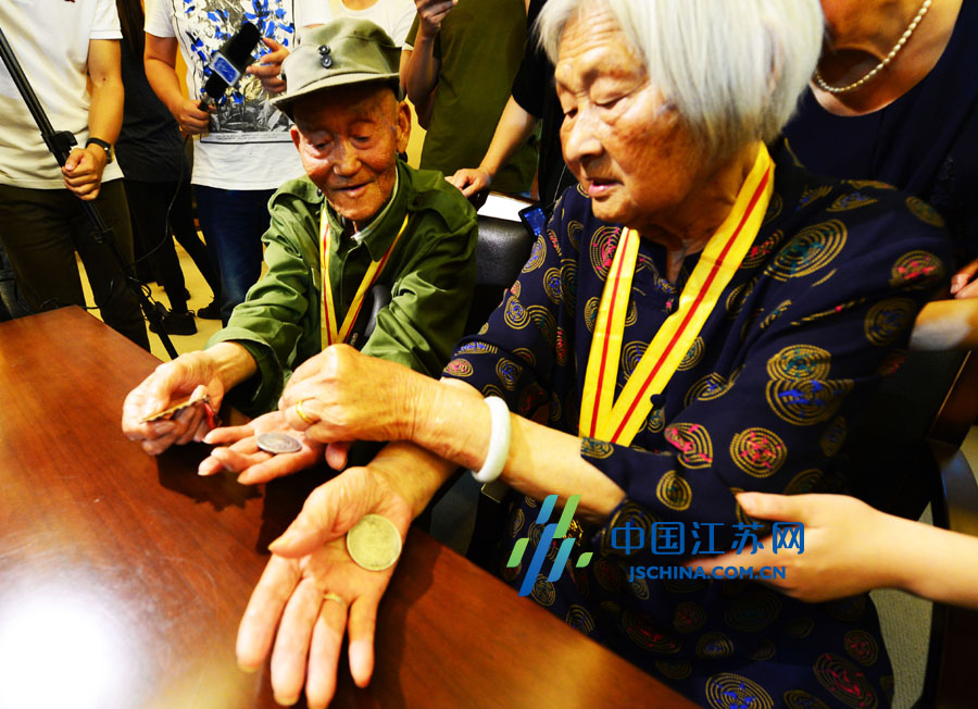 昨日,在位于江东门的侵华日军南京大屠杀遇难同胞纪念馆,来自泗洪县的抗战老兵张道干和来自河南南阳的杨美田老人,向纪念馆捐赠收藏70多年的3块银元和张道干在朱家岗战斗中缴获的一枚日军奖章。