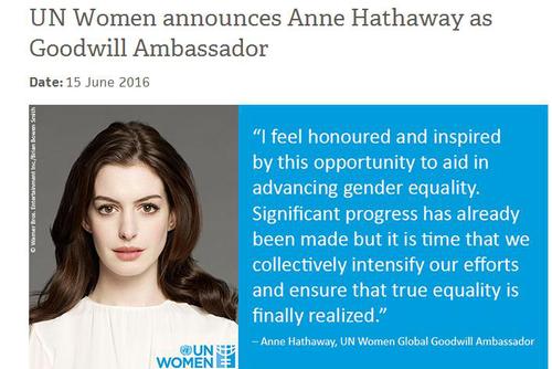 台湾中时电子报6月16日消息,联合国妇女署(UN Women)宣布任命好莱坞女星安妮·海瑟薇(Anne Hathaway)为联合国妇女亲善大使,期望她可以引起社会各界关注。