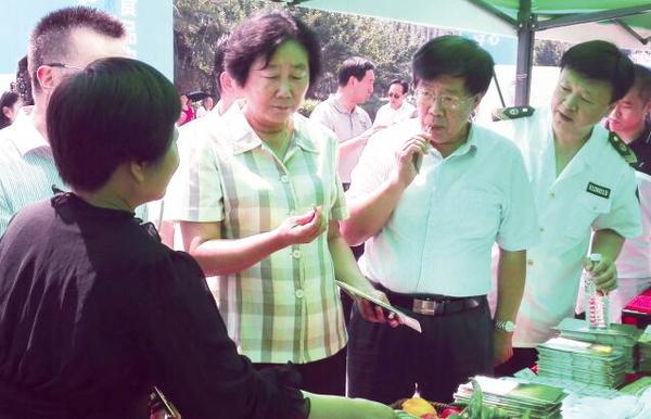 6月13日,陕西省政协副主席、省工商联主席冯月菊来到西安大明宫购物广场,在全省“食品安全周”主场活动品尝高陵无公害蔬菜。(刘杰 摄)
