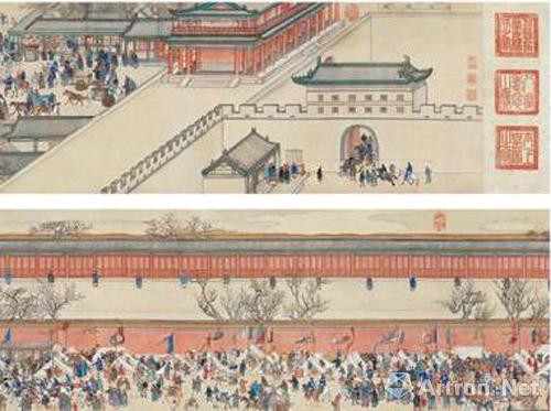 这幅手卷尺幅很大,纵42厘米,横1800厘米。全图人物众多,图画用笔细致入微,色彩鲜艳饱满,全图以写实的笔法描绘了一个历史时刻的片断,是乾隆时期清朝宫廷纪实绘画的一件佳作。此画卷曾经著录于《石渠宝笈》,杨仁恺先生著的《国宝沉浮录----故宫散佚书画见闻考略》一书。它的诸多优势聚于一身,使它有幸开创历史,成为了第一件过亿拍品。