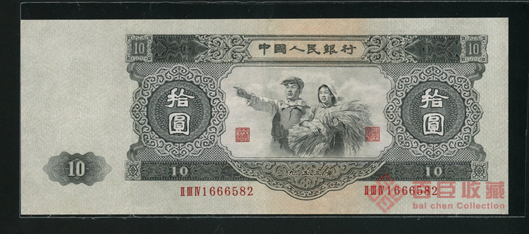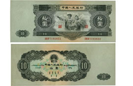 仔细观察黑十元纸币纸币,我们可以发现很多有意思的地方。它整体呈现黑白两色。感觉就像用一般的打印机打印的一样,纸张的质量也不是很好,跟现在的人民币简直没法比。正面主题图像是一男一女的工人和农民。背面没什么特殊,就是花型图案和国徽。整体给人很平凡的的感觉。但还是有它的特点的,像左边的留白比较大,正面的左边也有国徽的水印等。就是这样一个看似不太华丽的黑十元纸币纸币,却如它那黑黑的颜色一样是纸币收藏界的一匹黑马,收藏价格往往在几十万以上,还有大大增值的趋势,可以说是当时发行的第二套人民币中的当之无愧的王者。