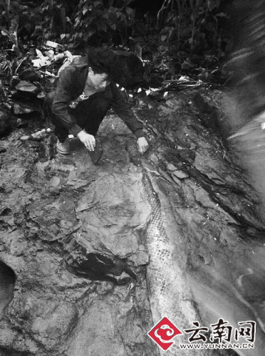 端午节以来,镇雄县坪上镇岩脚村民小组境内连日阴雨不断。12日下午,当地一条小河河水上涨,河岸边,一个埋藏在地下石头里的“怪物”被冲刷出来:这个“怪物”紧紧地镶嵌在风化石里,裸露部位长约130厘米,截面直径约17厘米,表皮光滑而坚硬,表皮上带有一块块均匀排列的黑色鳞片。因为不知道这个“怪物”的身份,当地村民在叹为观止之余,纷纷在微信圈内晒图和求证。