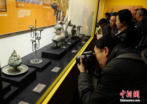 3月2日,《五色炫曜——南昌汉代?;韬罟脊懦晒埂吩诒本┦锥疾┪锕菘?。在展厅中,几乎每组(件)文物前都围满了观众,甚至有七旬老人和十来岁的孩子。 中新社记者 侯宇 摄