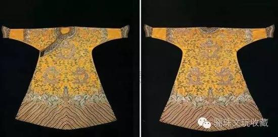 民间收藏的龙袍本身体量就很少,因此在拍场上往往屡创新高!2006年,一件罕见的乾隆镶珠龙袍,在香港苏富比曾以1468万元成交,成为当时清朝织绣拍卖纪录。2008年,一件缺少马蹄袖、袖子和云领的清代雍正龙袍在嘉德也曾以69万元成交!