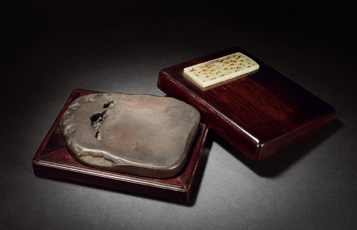 图中这方清代端砚,雕凿为鹅形,以端溪籽石为材,自然随形。长15厘米、宽12厘米,规格小巧。局部留皮,有多处石眼。此砚,砚堂砚池精巧实用,仿生雕刻,生动传神,其中一处石眼刻为鹅睛,有画龙点睛之妙,另配红木盒,是一方不可多得的好端砚。