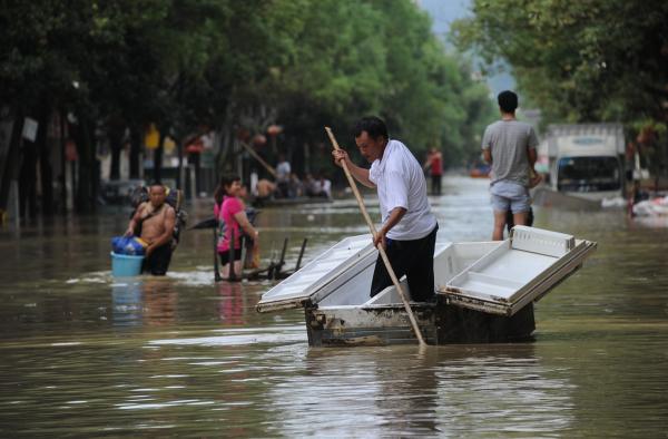 湖南湘西暴雨引发山洪逾3千人转移。 6月20日,民众在被洪水围困的龙山县里耶镇街头前行。新华社发(张谨摄)