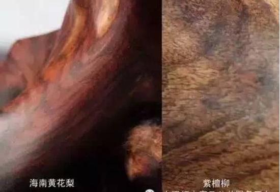 第五招:看纹路。?;莆评矸浅7岣?,变化无穷,颜色渐变。纹理颜色有象牙色、黄色、紫黑、黄红等多种颜色共存,无论线条如何变化总是清晰分明。而紫檀柳纹理显得僵硬,木纤维粗犷,但纹理多显得杂乱。