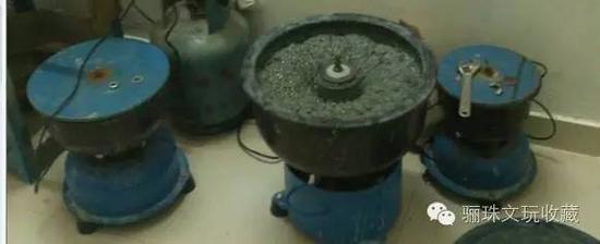 1200目精雕工具细磨后,可以放震机里打磨了。一般雕刻后要放240目的金刚砂,才能打磨去掉砂眼刀痕,但雕刻细节也会有磨损,经过计算,240目砂打磨完成后,表面的磨损是0.3毫米,对细活来说是不能忍受的损害。