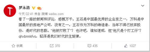 宝能系提议罢免王石等董事,锤子科技CEO罗永浩在微博上表示,看了一路的新闻和评论,感慨万千。王石是中国最优秀的企业家之一,万科是中国最好的房地产公司,没有之一。王石作为万科的缔造者,当年不得已放弃股份,是时代的悲剧。“他被打败了”?也许吧,谁知道呢,但“他只是个打工仔”?qhxbnnkfvs,轻浮是我们时代的主旋律。
