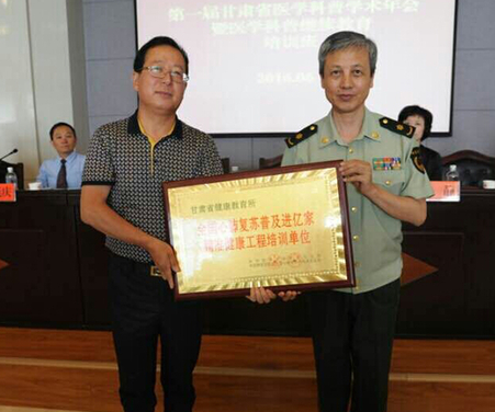 甘肃省人民医院被授予“全国心肺复苏普及进亿家精准健康工程培训单位”和“腹部心肺复苏应用转化基地”?;嵘?,中华医学会科学普及分会主任委员王立祥教授、中国研究性医院心肺复苏专业委员会副主任委员李静教授做了“中华精准健康传播方略”和“精准健康传播CPR”的专题报告,并向甘肃省健康教育所、甘肃省人民医院授牌。