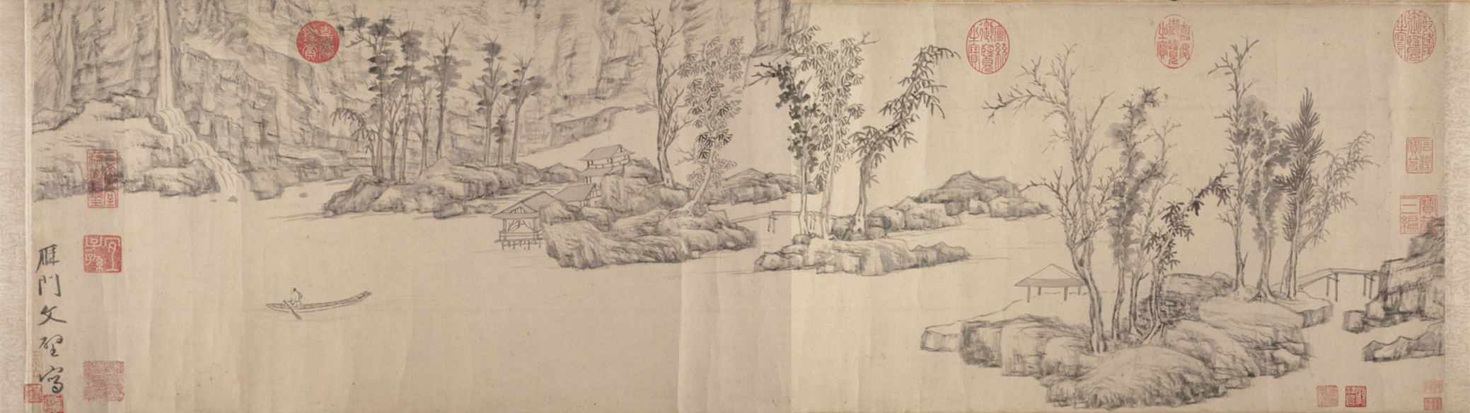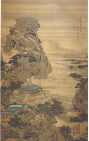 本幅无款识。对幅清代乾隆皇帝题诗。钤乾隆内府诸收藏印?!妒拧分?。此幅为清宫旧藏,是故宫博物院庋藏的几幅时代较早、传为唐人的绘画作品之一。乾隆题诗中有“九成琼殿叠,百道玉泉翻”句,认为此图写九成宫。事实上,画面描绘的是贵族出行和游乐的场面,繁密富丽,充满亭台殿阁,其间人物、鞍马、舟车往来。画法虽具大小李将军“金碧山水”传派的特点,实为南宋画家所作。虽然图上面描述贵族出行和游乐的场面,但身处山中,亭台楼阁,十分清凉。