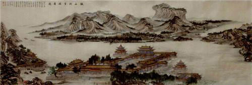 《清冷枚避暑山庄图》反映了康熙时期避暑山庄建筑的图样,对于了解避暑山庄的建筑沿革有着重要的图像价值。此图以全景式构图描绘了皇家园林的壮观气势。款署:“小臣冷枚恭画?!鳖浴俺祭涿丁?、“夙夜匪懈”二印。鉴藏印有:“乾隆御览之宝”、“嘉庆御览之宝”、“石渠宝笈”、“养心殿鉴藏宝”、“宣统御览之宝”。避暑山庄,绝佳的地理位置,因山就水,不愧是帝王们每年最爱去的地方。