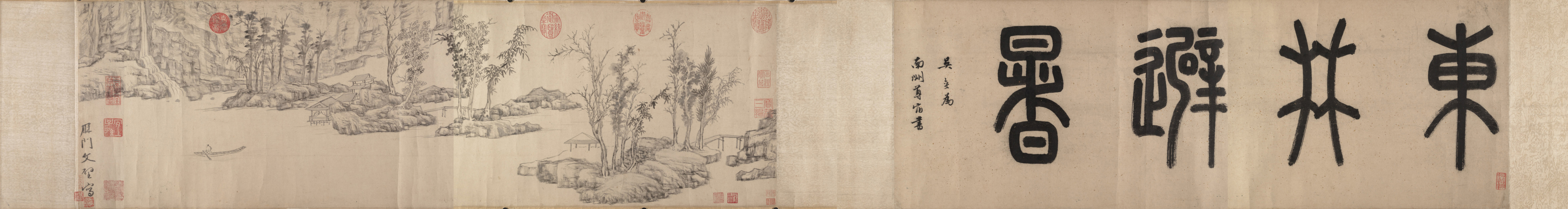 本幅行书自题七绝诗一首“短策轻衫烂漫游,暮春时节水西头。日长绿树青帏合,雨过遥山碧玉浮?!焙箢浴拔尼缑饔 ?、“玉磬山房”印。右下角有“玉兰堂印”鉴藏印,画心有“世美堂印”、“马寒中印”等鉴藏印。裱边及外签有当代书画家狄葆贤(平子)题诗并记,钤藏印“平等阁主人”等。题记详述了此作原为其父于清同治末年购得、而他本人则在甲子年(1924年)夏六月重新装裱的递藏过程。