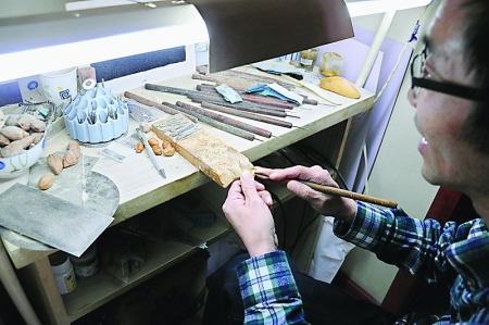 “我原本就有绘画、雕刻的基础,所以学习起来比一般人快很多?!币话闳诵枰肽暄Щ岬墓ひ?,孙兴轶只用了一个月?!拔一辜堑梦业牡谝患说褡髌肥且淮?罗汉。虽然,现在看来,那件作品有很多需要改进的地方,但是当时的我,看着自己完成的第一件作品,心里有种难以言表的兴奋与激动?!彼镄碎笏?。