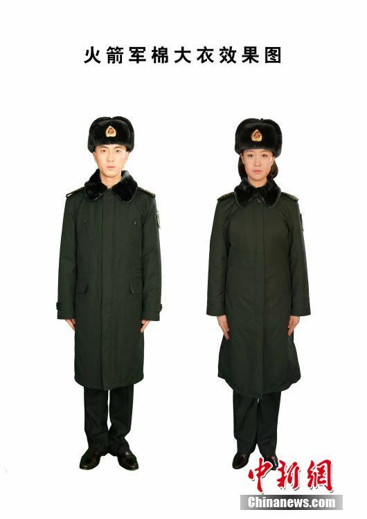经中央军委批准,7月1日,火箭军官兵将正式启用穿着新式礼(常)服。据悉,火箭军新式服装采用了墨绿色和卡其色的邻近色组合,创新了军种服装色彩搭配方式,整体色彩集中、简单、精致;也自此实现了陆、海、空、火箭四大军种“两绿两蓝”的色彩格局。图为棉大衣。