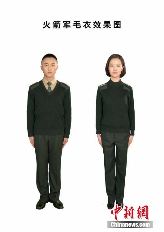 经中央军委批准,7月1日,火箭军官兵将正式启用穿着新式礼(常)服。据悉,火箭军新式服装采用了墨绿色和卡其色的邻近色组合,创新了军种服装色彩搭配方式,整体色彩集中、简单、精致;也自此实现了陆、海、空、火箭四大军种“两绿两蓝”的色彩格局。图为毛衣。