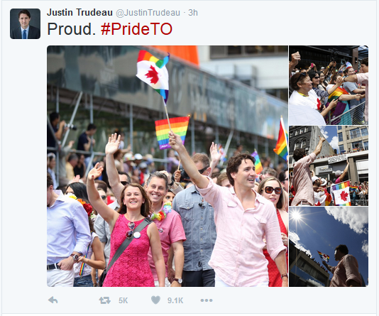 特鲁多在自己的官方推特账号上写到:骄傲。以此表达自己参与此次游行的心情。