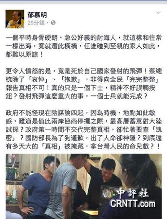 郁慕明在“脸书”上质疑台当局处理导弹误射事件的作法(图片来源:中评社)