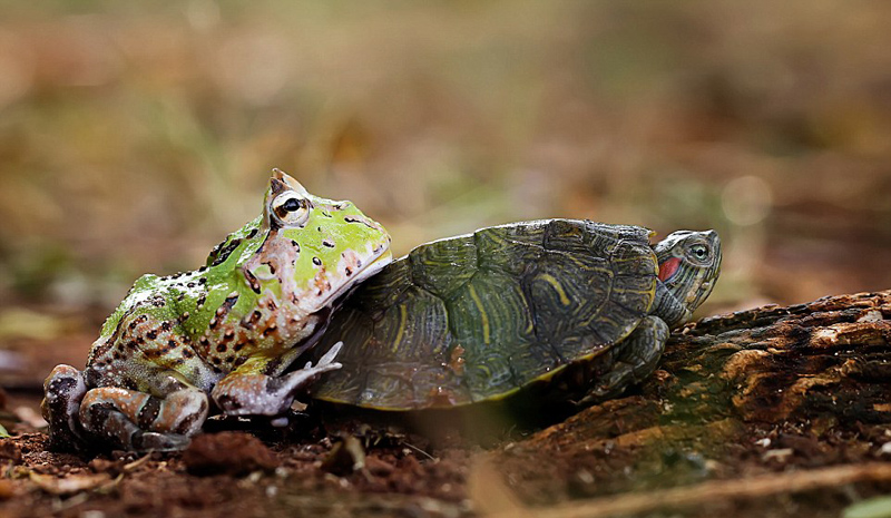 似乎是觉得乌龟爬行实在太慢,最终,这只青蛙终于忍受不了,从乌龟背上跳下,伸出爪子开始推着乌龟前行。