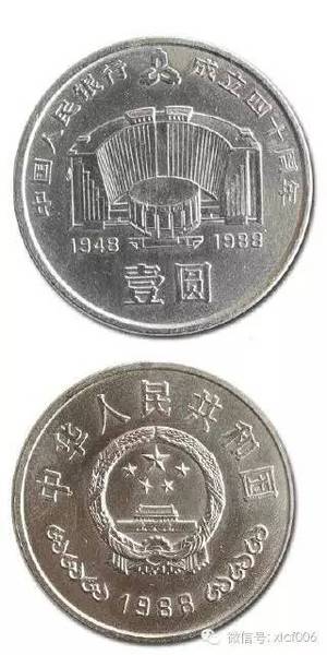 纪念中国人民银行成立40周年,中国人民银行于1988年12月发行中国人民银行成立40周年纪念币,面值为1元,每套1枚。面值 1 元,发行量只有206万枚。