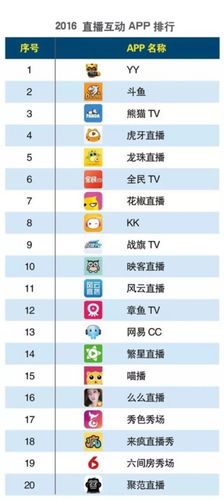 7月5日,《互联网周刊》发布“2016上半年度中国APP分类排行”。报告显示,在直播互动APP排行榜中,游戏直播类依旧占据主流,YY、斗鱼、熊猫TV名列前三。而在泛娱乐直播APP领域,花椒直播名列第一,映客直播紧随其后排名第二。