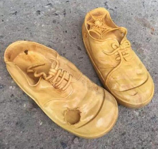 这双鞋子不能穿,其实是一款工艺品。是用老料崖柏制作而成,是不是突然觉得三千块钱不贵呢?