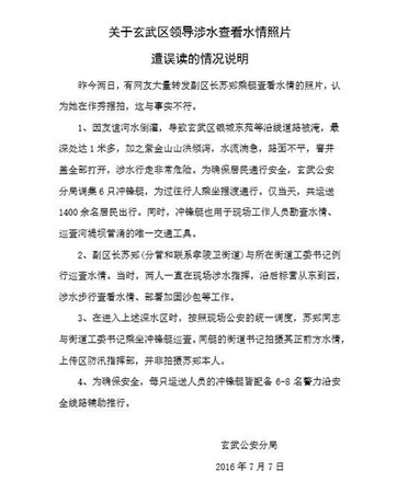 照片显示一名穿白色上衣的女士坐在皮划艇上,艇中一身着黑色衣服的女性疑似正为其拍照,而多名身着特警制服的人员在水中扶着皮划艇,艇上有“南京玄武”字样。冲锋艇漂浮在水面上,周围有七、八名身穿疑似警服的男子在推拉冲锋艇,水深达到这几位男子的大腿部位。有网友指出该场景疑为5日南京市及玄武区部分官员在查看抗涝工作,“摆拍”的女性是玄武区委常委、副区长苏郑。