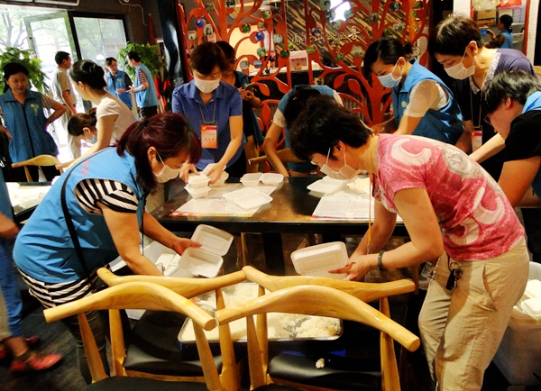 市委会还积极与公益素食馆联系,订购了100份午餐送往灾区。7月6日一早,市委会机关和市直支部部分党员来到素食馆做志愿者,大家主动分盒、盛饭、装箱、擦桌子、扫地……忙得热火朝天。中午,大家奔赴博望,亲手将午餐送到了博望中学集中安置点的灾民手中。