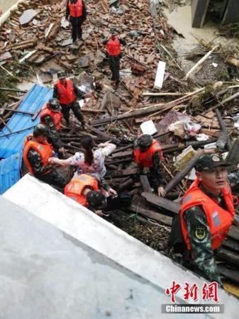 7月9日13时45分,今年第1号台风“尼伯特”在福建石狮沿海登陆。受台风影响,强降雨侵袭福州,多地内涝严重。图为福州永泰县一受灾点,一片狼藉。 中新社记者 侯晓玲 摄