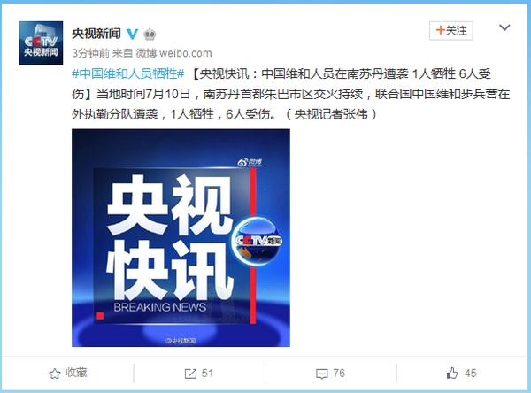 【央视快讯:中国维和人员在南苏丹遭袭 1人牺牲 6人受伤】当地时间7月10日,南苏丹首都朱巴市区交火持续,联合国中国维和步兵营在外执勤分队遭袭,1人牺牲,6人受伤。(央视记者张伟)