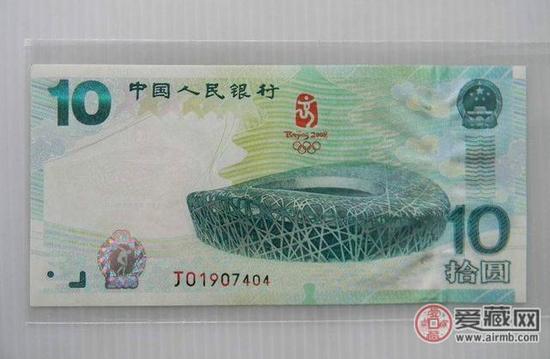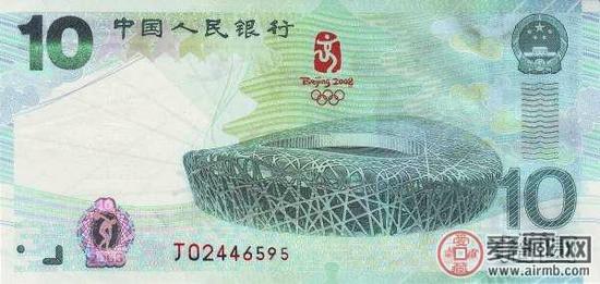 这张奥运人民币纪念钞的正面图案是北京奥林匹克运动会主会场——国家体育场,而它的上方是第29届奥林匹克运动会会徽图案,背景为天坛图案;纪念钞的背面图案是古希腊雕塑“掷铁饼者”、运动员群像图案及“2008”字样,主景图案下方还有年号为“2008”以及我么行长的印章。近年来,奥运钞也是作为一款非常炙手可热的品种,短短纪念,已经升值非常高,这张纪念钞在当年一上市就遭到全国各地的疯狂抢购,把同期的其他奥运纪念品远远地抛在脑后。如今,这张奥运纪念钞的价格已经升值了几十倍,价格维持在4000元左右!