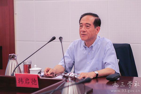 韩启德说,习近平总书记的重要讲话回顾了中国共产党从1921年到2016年这95年来的奋斗历程、做出的历史贡献、取得的历史经验,并面向未来对全党提出不忘初心、继续前进的8方面要求,与中国特色社会主义理论体系一脉相承,形成一个有机体系,具有昭示未来的宣言性质。习近平总书记在讲话中重申发展是第一要务,坚持以经济建设为中心,改革开放是当代中国最鲜明的特色。这些是中国共产党一贯坚持的基本路线和方针,也是多年来中国建设与发展的基本经验,更是中国共产党带领全国人民继续前进的重要保障。习近平总书记的讲话提出道路自信、理论自信、制度自信、文化自信的新观点,并且指出“文化自信是更基础、更广泛、更深厚的自信”,更加强调了中国在整个世界现代化进程中的责任。韩启德强调,习近平总书记讲话的核心是深入剖析了什么是中国共产党建党时的“初心”。8个“不忘初心、继续前进”中,最根本的是人民立场。中国共产党之所以取得革命和建设的成功,最根本的原因是一切为了人民、一切依靠人民。革命战争年代,中国共产党发动农民打土豪分田地,成功走出了一条农村包围城市,武装夺取政权的道路。当前,符合绝大多数人民的愿望和意志依然是推动各项工作顺利开展的根本着眼点和落脚点。韩启德指出,九三学社各级组织和广大社员要认真学习习近平总书记七一重要讲话精神,与正在开展的中国特色社会主义学习实践活动紧密结合,深入社会、积极实践,了解国情社情,为经济社会发展建真言献良策;讲好中国故事、统一战线和多党合作故事和九三学社故事,把九三学社先贤和身边社员为国家民族无私奉献的事迹更广泛地弘扬,把九三学社爱国民主科学优良传统一代代传下去。