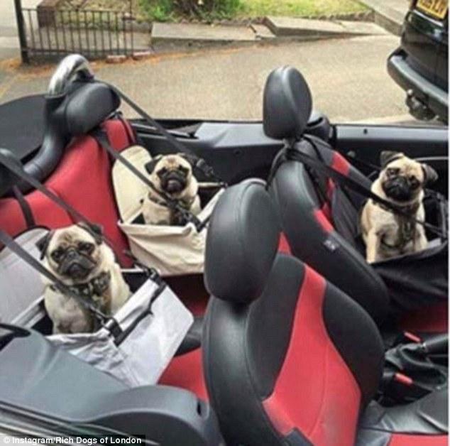 图为开篷跑车上的三只哈巴狗,坐在主人专为其设的座位上。
