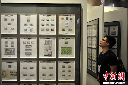 7月11日,观看展览的观众,部分邮票堪称稀世珍宝。中新社记者 刘冉阳 摄