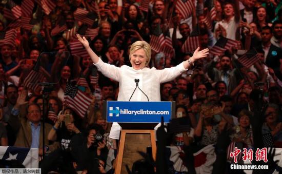 资料图:当地时间6月7日,美国纽约,美国民主党总统参选人希拉里在布鲁克林的一个集会上,宣布自己在民主党总统候选人提名战中获胜,成为美国大选历史上首位获得主要政党提名的女性。