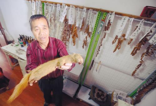 齐师傅入行十多年,现在只要一过手,就知道是哪里的材料?!暗ざ?、吉林、朝鲜的黄鼠狼尾巴偏红,黑龙江的则焦黄,有光泽。华北的有黑尖,发干, 弹力差?!逼胧Ω邓担衷诤旅实脑隙喙褐糜诠?、俄罗斯、黑龙江,每年采购1000支到3000支,一般制成的笔头长30毫米到55毫米。 “60毫米的就很稀有了,一年也不一定能遇到十支八支?!逼胧Ω刀圆牧媳9艿煤芫?,“最怕的就是虫子,以前厂里用樟脑球,现在搬到居民楼里,我就在尾巴 下垫一层烟叶防虫。每年也要拿出来晒一晒,要保持毛齐顺,不打弯?!逼胧Ω祷嵋淮伟呀唤锥蔚挠昧媳负茫白鲂”?,一根尾巴能做四五个。做大笔,一根可能 就做一个半个。”