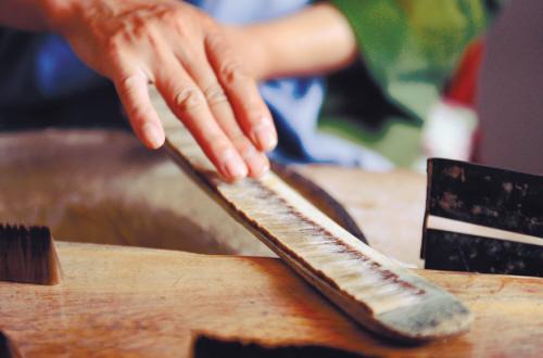 然后便是“梳”。李世美身前的桌子上有一个大洞,洞里放着一个金属盆,里面盛着半盆石灰水。熥好晾干的毛要放在水里浸湿,“石灰可以杀虫?!苯?湿后的毛要加上苘麻,然后夹在专业工具上反复梳理,“苘麻起到加健的作用,使毛笔更耐用。”李世美有五六把牛骨制成的梳子,要经过成百上千次的梳理,绒毛 才能梳掉,尾毛和苘麻才能齐顺、均匀。