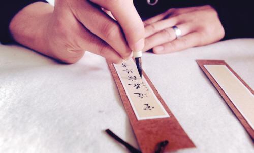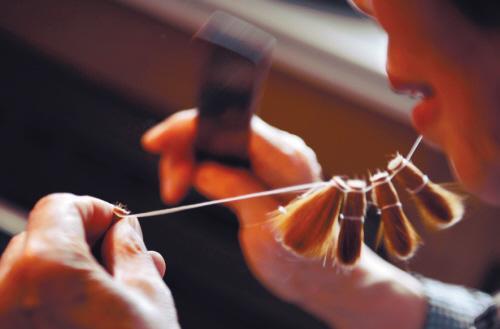 然后,张国茹会拿着笔,让笔尖轻轻压在手指上画圈,没有一根支出来的杂毛,这才过关。张国茹将笔头粘在笔杆上,再用胶水粘住笔头。“这样笔头就定型了,使用时用水一泡就开了。”