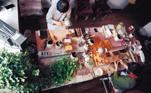张国茹坐在李世美的斜对面,一头过耳短发,多已发白。她的面前放着一盏台灯,即使大白天也要亮着。因为要修整出笔锋,就要精细到每一根笔毛,长时间面对着灯光的炙烤,张国茹总觉得热,她这一侧的窗总开着。在一间屋子工作了20多年的两人,倒像是分别身处冬夏。