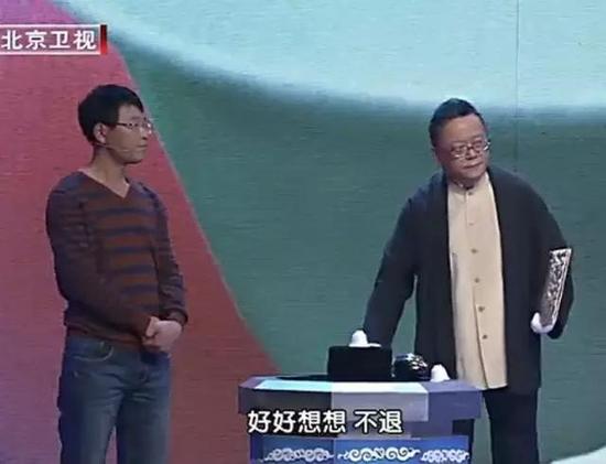 王刚:好像是熟悉的一个声音,退了吧。那么,退了无非就是得不到由北京盈时国际拍卖有限公司提供的《天下收藏》录制纪念的金牌一枚了。但是可以完整地拿回去,以后朋友两人喝点小酒,特别好,是不是,对不对,好好想想?