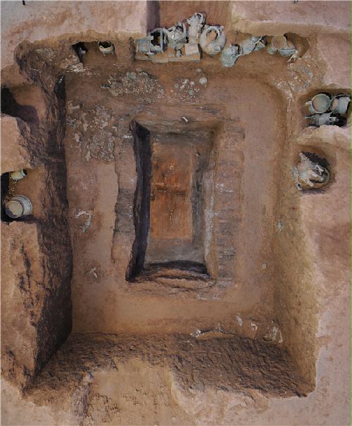 通过发掘,考古专家发现了目前石鼓山西周墓地中最大的一座墓葬。该墓葬呈长方形,深8米、宽约4米,为竖穴土圹墓,口小底大,约16.26平方米,棺室周围有熟土或生土二层台。属于单人葬,头向朝着地势较高的方向,有东向、南向及西北向。葬具均为木质,随葬品一般置于头部附近的二层台或壁龛内。