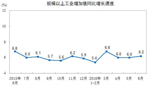 中新网7月15日电 据统计局网站消息,统计局今日公布数据显示,6月份,规模以上工业增加值同比实际增长6.2%(以下增加值增速均为扣除价格因素的实际增长率),比5月份加快0.2个百分点。从环比看,6月份,规模以上工业增加值比上月增长0.47%。1-6月份,规模以上工业增加值同比增长6.0%。